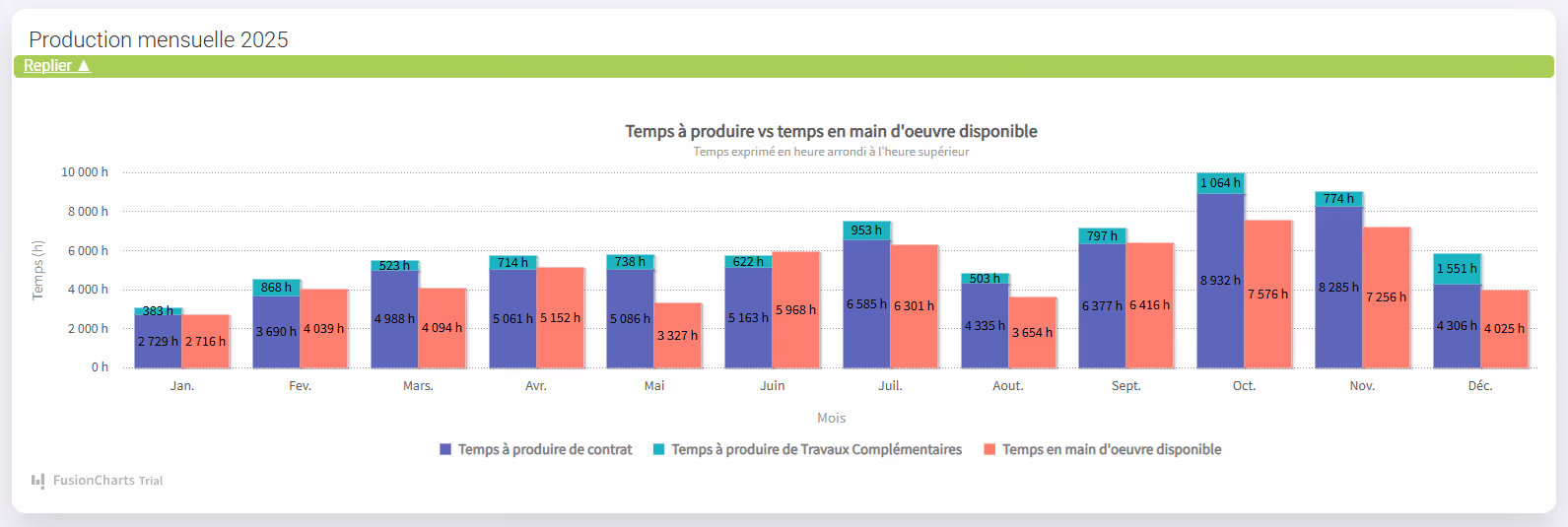 Optimisez votre production mensuelle en ajustant vos ressources selon les besoins opérationnels. L'outil vous aide à anticiper les pics d'activité et à redistribuer les ressources pendant les périodes creuses.
